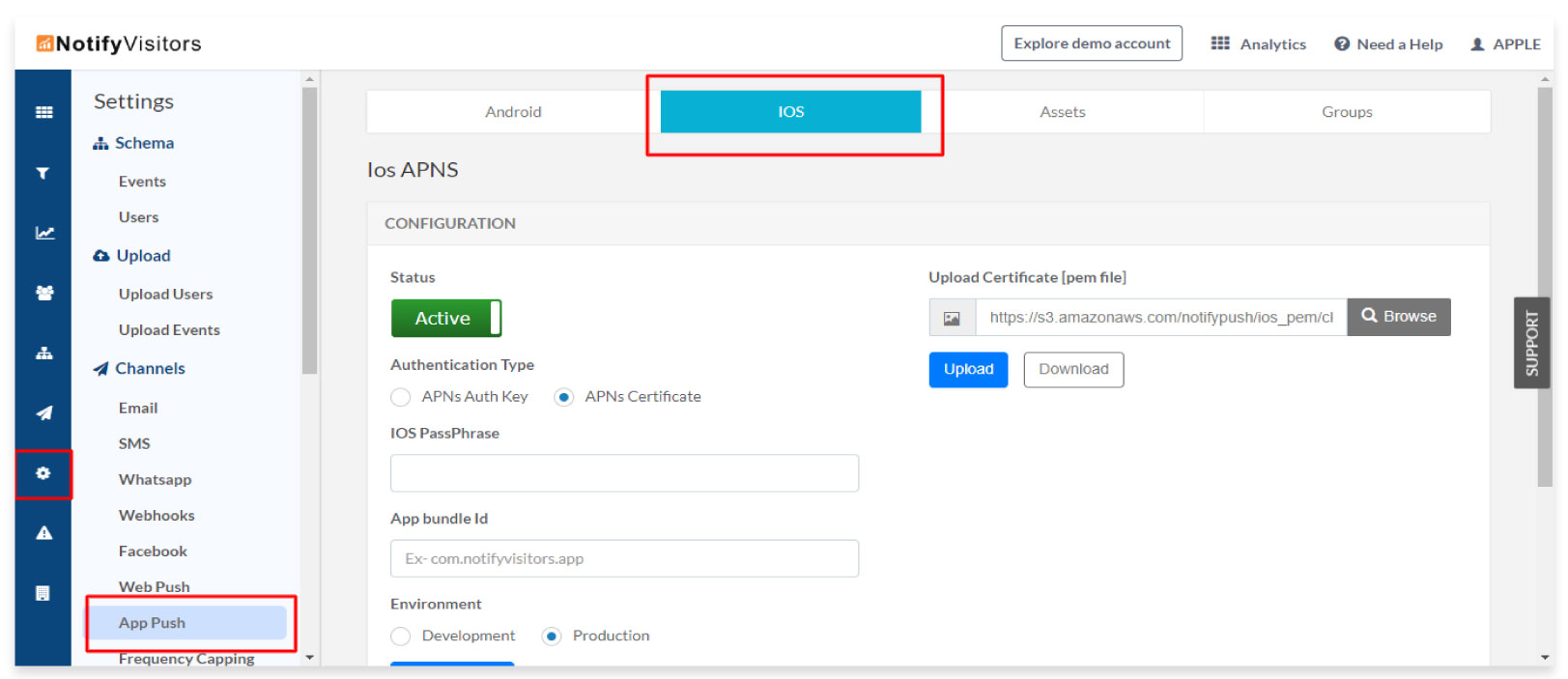 Now, to complete the configuration, you need to update the status to Active and select the Authentication type. Further, add iOS PassPhrase (must be the same case sensitive as you have created in previous steps) and App bundle ID then select the environment, and save the changes.